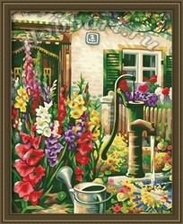 Состав набора: загрунтованный хлопковый холст с контурным рисунком закреплен на деревянном подрамнике размером 40х50см; водно-дисперсионные (акриловые) краски, не требующие смешивания, в герметичных тубах; пустые пластиковые баночки для выдавливания краски; наклейки с номерами для пустых баночек; комплект кистей; чёрно-белая инструкция (повторяет контурный рисунок на холсте); цветная инструкция (репродукция картины); инструкция с рекомендациями по использованию набора; металлические части крепления для подвешивания картины.