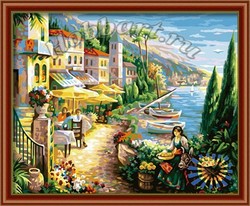 Состав набора: загрунтованный хлопковый холст с контурным рисунком закреплен на деревянном подрамнике размером 40х50см; водно-дисперсионные (акриловые) краски, не требующие смешивания, в герметичных тубах; пустые пластиковые баночки для выдавливания краски; наклейки с номерами для пустых баночек; комплект кистей; чёрно-белая инструкция (повторяет контурный рисунок на холсте); цветная инструкция (репродукция картины); инструкция с рекомендациями по использованию набора; металлические части крепления для подвешивания картины.