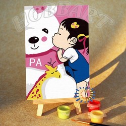 Состав набора: загрунтованный хлопковый холст с контурным рисунком (наклеен на картонную основу) размером 10х15см; водно-дисперсионные (акриловые) краски, не требующие смешивания, в герметичных тубах; одна нейлоновая кисть; деревянный мини-мольберт для готовой работы.