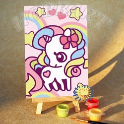 Состав набора: загрунтованный хлопковый холст с контурным рисунком (наклеен на картонную основу) размером 10х15см; водно-дисперсионные (акриловые) краски, не требующие смешивания, в герметичных тубах; одна нейлоновая кисть; деревянный мини-мольберт для готовой работы.