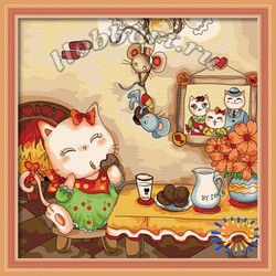 Состав набора: загрунтованный хлопковый холст с контурным рисунком закреплен на деревянном подрамнике размером 30х30см; водно-дисперсионные (акриловые) краски, не требующие смешивания, в герметичных тубах; пустые пластиковые баночки для выдавливания краски; наклейки с номерами для пустых баночек; комплект кистей; чёрно-белая инструкция (повторяет контурный рисунок на холсте); цветная инструкция (репродукция картины); инструкция с рекомендациями по использованию набора; металлические части крепления для подвешивания картины.