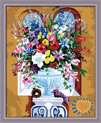 Состав набора: загрунтованный хлопковый холст с контурным рисунком закреплен на деревянном подрамнике размером 40х50см; водно-дисперсионные (акриловые) краски, не требующие смешивания, в герметичных тубах; пустые пластиковые баночки для выдавливания краски; наклейки с номерами для пустых баночек; комплект кистей; чёрно-белая инструкция (повторяет контурный рисунок на холсте); цветная инструкция (репродукция картины); инструкция с рекомендациями по использованию набора; металлические части крепления для подвешивания картины.