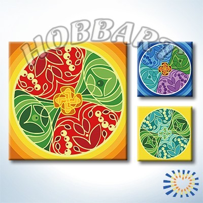Состав набора: один загрунтованный хлопковый холст с контурным рисунком мандалы закреплен на деревянном подрамнике размером 40х40см; водно-дисперсионные (акриловые) краски в герметичных тубах; палитра для смешивания красок, комплект кистей; подробная инструкция с рекомендациями по испоьзованию набора; цветная инструкция с девятью предлагаемыми вариантами разрисовки мандалы; металлические части крепления для подвешивания готовой картины.