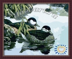 Состав набора: загрунтованный хлопковый холст с контурным рисунком закреплен на деревянном подрамнике размером 40х50см; водно-дисперсионные (акриловые) краски, не требующие смешивания, в герметичных тубах; пустые пластиковые баночки для выдавливания краски; наклейки с номерами для пустых баночек; комплект кистей; чёрно-белая инструкция (повторяет контурный рисунок на холсте); цветная инструкция (репродукция картины); инструкция с рекомендациями по использованию набора; металлические части крепления для подвешивания картины.