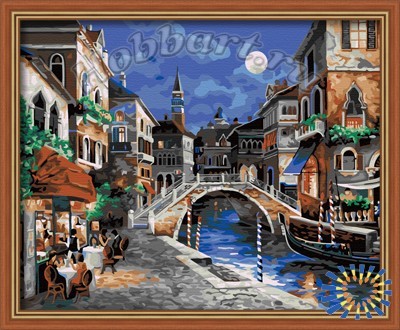 Состав набора: загрунтованный хлопковый холст с контурным рисунком закреплен на деревянном подрамнике размером 40х50см; водно-дисперсионные (акриловые) краски, не требующие смешивания, в герметичных тубах; пустые пластиковые баночки для выдавливания краски; наклейки с номерами для пустых баночек; комплект кистей; чёрно-белая инструкция (повторяет контурный рисунок на холсте); цветная инструкция (репродукция картины); инструкция с рекомендациями по использованию набора; металлические части крепления для подвешивания картины.