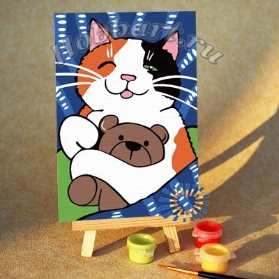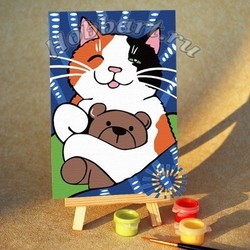 Состав набора: загрунтованный хлопковый холст с контурным рисунком (наклеен на картонную основу) размером 10х15см; водно-дисперсионные (акриловые) краски, не требующие смешивания, в герметичных тубах; одна нейлоновая кисть; деревянный мини-мольберт для готовой работы.