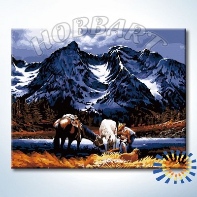Состав набора: загрунтованный хлопковый холст с контурным рисунком закреплен на деревянном подрамнике размером 40х50см; водно-дисперсионные (акриловые) краски, не требующие смешивания, в герметичных тубах; пустые пластиковые баночки для выдавливания краски; наклейки с номерами для пустых баночек; комплект кистей; чёрно-белая инструкция (повторяет контурный рисунок на холсте); цветная инструкция (репродукция картины); инструкция с рекомендациями по использованию набора; металлические части крепления для подвешивания картины.
