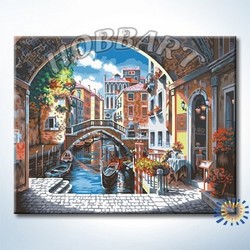 Состав набора: загрунтованный хлопковый холст с контурным рисунком закреплен на деревянном подрамнике размером 40х50см; водно-дисперсионные (акриловые) краски, не требующие смешивания, в герметичных тубах; пустые пластиковые баночки для выдавливания краски; наклейки с номерами для пустых баночек; комплект кистей; чёрно-белая инструкция (повторяет контурный рисунок на холсте); цветная инструкция (репродукция картины); инструкция с рекомендациями по использованию набора; металлические части крепления для подвешивания картины.