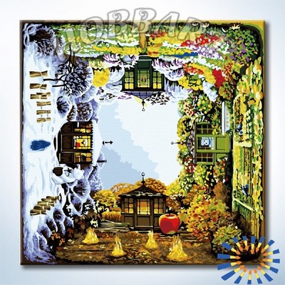Состав набора: натянутый на подрамник загрунтованный холст с нанесенным цветным контурным рисунком, комплект акриловых красок в герметичных тюбиках, нейлоновые кисти, крепление для подвешивания картины, черно-белый контрольный лист.