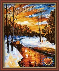 Состав набора: загрунтованный хлопковый холст с контурным рисунком закреплен на деревянном подрамнике размером 40х50см; водно-дисперсионные (акриловые) краски, не требующие смешивания, в герметичных тубах; пустые пластиковые баночки для выдавливания краски; наклейки с номерами для пустых баночек; комплект кистей; чёрно-белая инструкция (повторяет контурный рисунок на холсте); цветная инструкция (репродукция картины); инструкция с рекомендациями по использованию набора; металлические части крепления для подвешивания картины.
