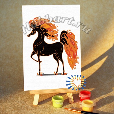 Состав набора: загрунтованный хлопковый холст с контурным рисунком (наклеен на картонную основу) размером 10х15см; водно-дисперсионные (акриловые) краски, не требующие смешивания, в герметичных тубах; пустые пластиковые баночки для выдавливания краски; наклейки с номерами для пустых баночек; одна нейлоновая кисть; деревянный мини-мольберт для готовой работы.